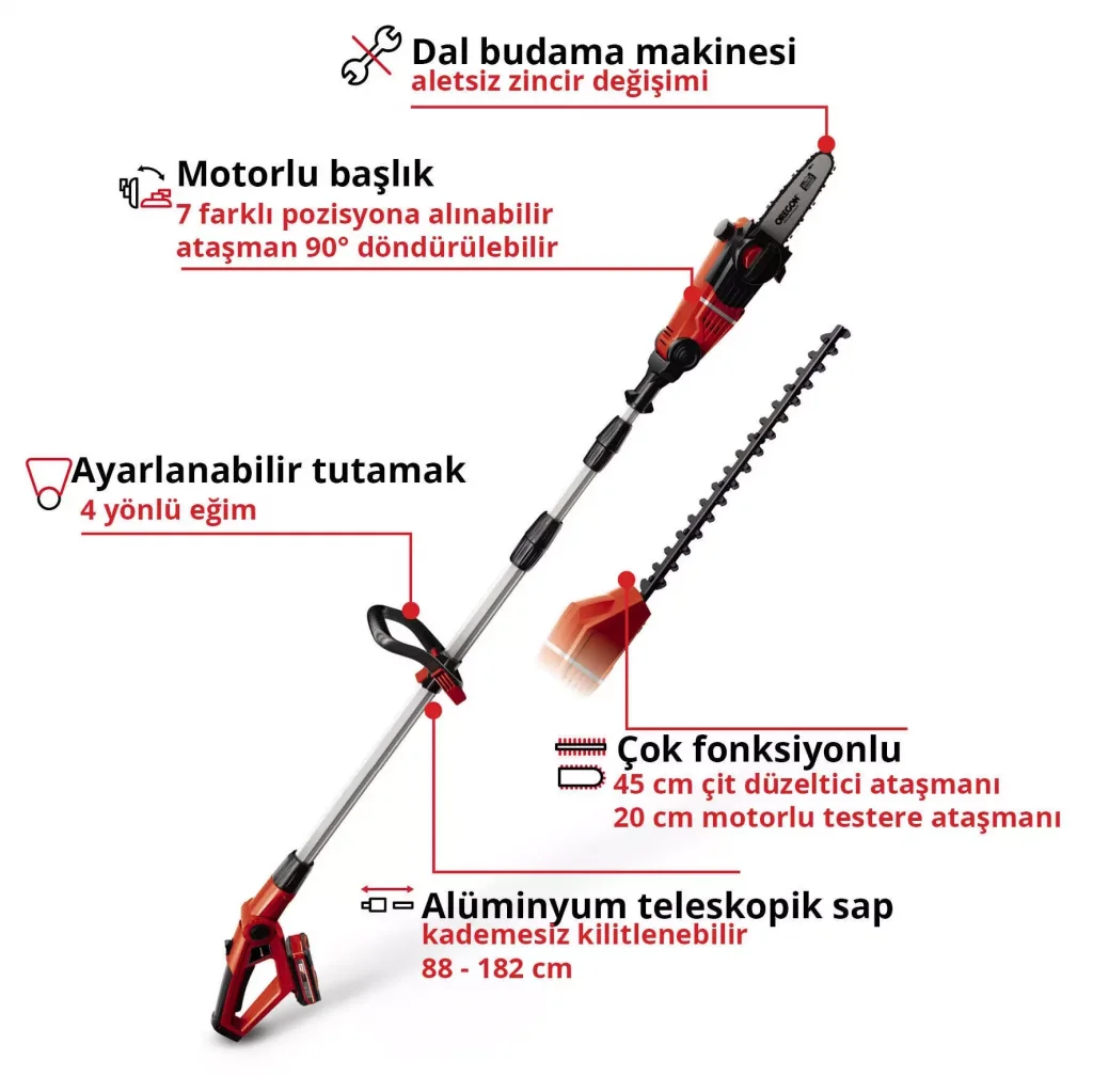 Akülü çok amaçlı dal budama makinesi GE-HC 18 Li T Kit, dalları ve yüksek çitleri yerden kolayca kesmek için güçlü bir cihazdır. Kit, 1 x 3.0 ah akü ve 60 dakikalık hızlı şarj için 1 x hızlı şarj cihazı içerir, akü ve şarj cihazı diğer tüm Einhell Power X-Change cihazları için de kullanılabilir. Metal dişli kutusu uzun kullanım ömrü sağlar ve OREGON kalite bıçak ve OREGON zincir temiz kesim sonuçları sağlar. Üst kısım 90° döndürülebilir ve zahmetsiz yatay kesimlere izin verir. Tırnak dayanağı, kesim işleri sırasında kaymayı önler. Otomatik zincir yağlama, bir yağ haznesi aracılığıyla Oregon zincirine gerekli yağlamayı sağlar. Gerektiğinde herhangi bir alet kullanmadan pratik zincir gerginliği ile sıkılabilir ve değiştirilebilir. Zincir yakalama cıvatası, zincirin bıçaktan istenmeyen şekilde kaymasını güvenilir bir şekilde önler. Lazerle kesilmiş ve elmas taşlanmış çelikten yapılmış çit kesme bıçağı temiz kesim sonuçları sağlar. Çit budama makinesi, sabit kesici muhafazası içinde güvenli ve rahat bir şekilde taşınabilir. GE-HC 18 Li T Kit, mevcut şarj seviyesini bir bakışta kontrol edebileceğiniz üç LED'li bir akü şarj seviyesi göstergesine sahiptir. Kademesiz olarak ayarlanabilen teleskopik tutamak, 880 ila 1820 mm arasında istenen çalışma yüksekliğine tam olarak ayarlanabilir. Yine kademesiz olarak ayarlanabilen ilave tutamak, pratik hızlı kilidi sayesinde her kullanıcıya uyarlanabilir. Zor kesimleri bile temiz ve hassas bir şekilde gerçekleştirmek için motor kafası 7 kademeli, ana tutamak ise 4 kademeli olarak eğimlendirilebilir. Böylece her çalışma durumuna göre ayarlanabilirler.
