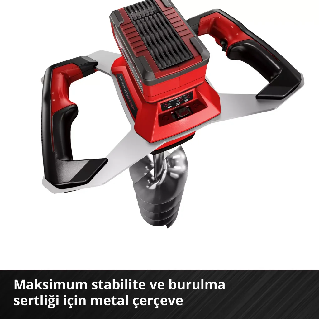 Einhell GP-EA 18/150 Li BL-Solo akülü toprak burgu makinesi ev ve hobi bahçecilerinin gözdesi, bahçenizi ekip biçerken ve çit yapımı, dekorasyon, hatta yuvarlak yataklar yapma gibi diğer bahçe işlerini yaparken çok iş gören bir üründür. Bu kablosuz cihaz bir burgu ucuyla verilir (80 cm uzunluğunda/15 cm çapında) Kablosuz burgu yüksek kalitede lityum iyon hücrelere sahip aküleri serideki tüm cihazlarla kullanılabilen Einhell Power X-Change ailesinin bir üyesidir. Batarya ve şarj aleti teslimata dahil değildir. Ayrı olarak temin edilebilmektedirler. Burgu PXC 18V bataryayla çalışmaktadır. Cihazın kömürsüz motoru yivli ucunu toprağa doğru ittirir ve gücü optimum olarak burguya iletir ve konvansiyonel karbon fırçalı motorlara kıyasla daha uzun süre çalışır. Cihazda bir de sağlam alüminyumdan bir dişli kutusu bulunmaktadır. Burgu üç farklı mod halinde ayarlanabilir: 1) Ucu çıkartmak için saat yönünün tersine dönüş 2) ECO güç modunda saat yönünde dönüş Yumuşak zeminde hafif delme işlemleri için normal güç ayarı ve 3) YÜKSEK güç modunda saat yönünde dönüş. Sert zeminler için maksimum güç ayarı. Sağlam metal çerçevesi azami dayanıklılık ve burulma sertliği sunarken, Softgrip yüzeyli ikili tutamağı ergonomik çalışma imkanı sunuyor.