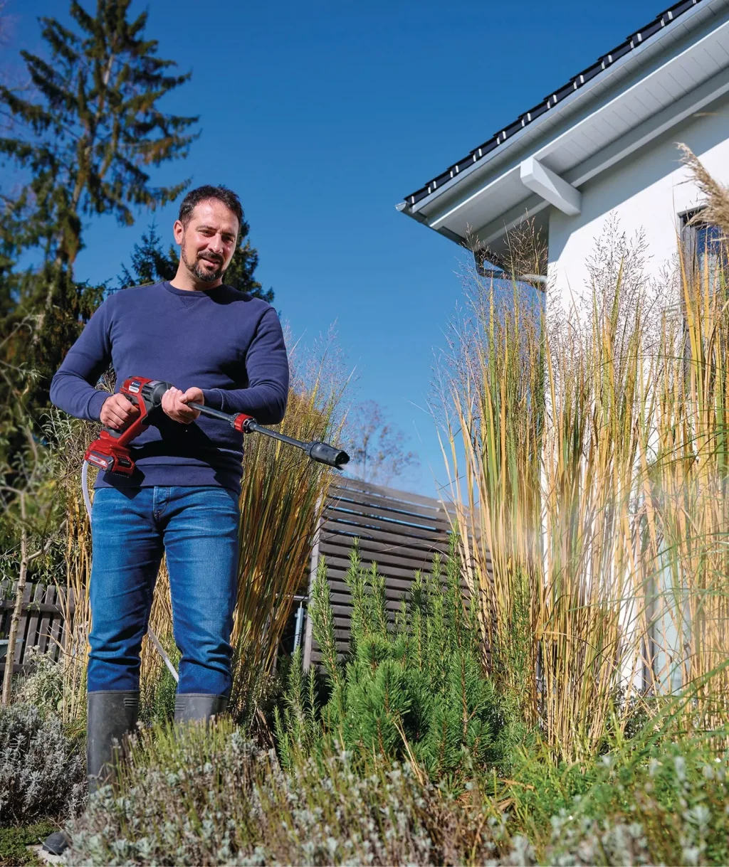 Einhell HYPRESSO 18/24-1 akülü basınçlı yıkama tabancası, bahçe ve teras çevresinde temizlik ve sulama için kablosuz esneklik sağlar. Akülü basınçlı yıkama tabancası, akülerin, şarj cihazlarının ve aletlerin sistem genelinde birbirleriyle esnek bir şekilde birleştirilebildiği Power X-Change ailesinin bir üyesidir. Akülü basınçlı yıkama 24 bar'a kadar basınçta ve saatte 240 litreye kadar su akış hızında çalışır. ECO modu, basınçlı yıkama makinesinin akü ömrünün bir düğmeye basılarak uzatılabileceği anlamına gelir. Püskürtme tabancası 4 yönlü ayarlanabilir bir nozul ile donatılmıştır. Dar ve geniş jetlerin yanı sıra sulama için bir sprey jeti ve inatçı kirleri temizlemek için bir döner jeti vardır. Basınçlı temizleme tabancası, hortum bağlantısı sayesinde doğrudan bahçe hortumuna bağlanabildiği gibi, su filtresi ve 5 metrelik emiş hortumu sayesinde kovalardan, bidonlardan veya havuzlardan da su alabilir. Hareket halindeyken standart PET şişelerdeki suyu kullanmak için bir şişe adaptörü dahildir. Set ayrıca iki uzatma mızrağı, araba yıkamak için ideal olan bir sprey şişesi ve aksesuarları saklamak için bir file çanta içerir. Buna ek olarak, su sıçramalarına ve neme karşı ek koruma sağlamak için Power X-Change akü için bir su sıçrama koruması da dahildir. HYPRESSO 18/24-1 akülü basınçlı yıkama tabancası akü veya şarj cihazı olmadan gelir. Bunlar ayrı olarak satılır.