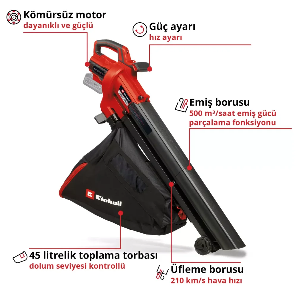 Einhell akülü yaprak toplama makinesi VENTURRO 18/210 ile sıkıcı yaprak toplama geçmişte kaldı! Güçlü 18 volt akülü yaprak toplama makinesi tamamen kablosuz olarak çalışır, aynı zamanda bir yaprak üfleyicidir ve ayrıca entegre bir öğütücüye sahiptir. Akülü cihaz, tüm akülerin, sistem cihazlarının ve şarj cihazlarının esnek bir şekilde birleştirilebildiği güçlü Einhell Power X-Change ailesinin bir parçasıdır. Saatte 500 m³ emiş kapasitesine sahip 3 kg'lık hafif cihaz, parçalama işlevi sayesinde orijinal hacminin onda birine indirgenmiş 45 litrelik bir toplama torbasında son bulan büyük miktarda yaprakları da hiç vakit kaybetmeden temizler. Kaliteli toplama torbası, doluluk seviyesini kontrol etmek için bir görüntüleme penceresi ile donatılmıştır ve yaprak vakumuna hızlı ve kolay bir şekilde takılır. Emme ve üfleme işlevleri arasında herhangi bir zamanda ve herhangi bir çaba sarf etmeden geçiş yapmak için bir geçiş anahtarı kullanılabilir. Akülü yaprak toplama makinesi yaprak üfleyici olarak kullanıldığında yaprakları 210 km/saate kadar üfler. Hız elektroniği ile emme ve üfleme gücü ayrı ayrı kontrol edilebilir ve bu da hacmi etkiler. İlave tutamak sayesinde, akülü yaprak toplama makinesi iki elle kullanımla en iyi şekilde yönlendirilebilir ve konforlu bir taşıma kayışı da optimum ağırlık rahatlığı sağlar. Emme borusunun ucundaki iki büyük tekerlek sayesinde akülü yaprak toplama makinesi engebeli arazilerde de rahatça hareket ettirilebilir ve bu sayede sırtınızı korur. Entegre duvar braketi sayesinde cihaz, yerden tasarruf sağlayacak şekilde saklanabilir.