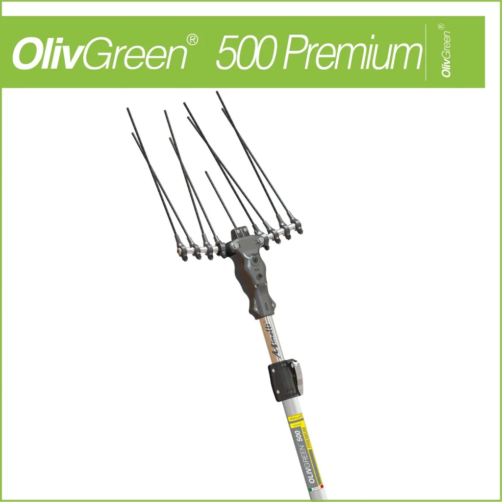 Üç kademeli FIRÇASIZ motorizasyona sahip Olivgreen 500 Premium akülü hasat makinesi, "profesyonel" zeytin hasadını tatmin etmek için tasarlanmıştır. Çeşitli zeytin ağaçları üzerinde çalışmaya uygun bir makinedir. Tarakların yanal şekli ve hareketi mükemmel hasatlar sağlar. Çok dengeli olan makine, kafa ünitesi, göreceli kilitleme sistemli teleskopik çubuk, 12V FIRÇASIZ motor + dişli motor ve üç vitesli AÇIK / KAPALI anahtarının bulunduğu tutamaktan oluşur.